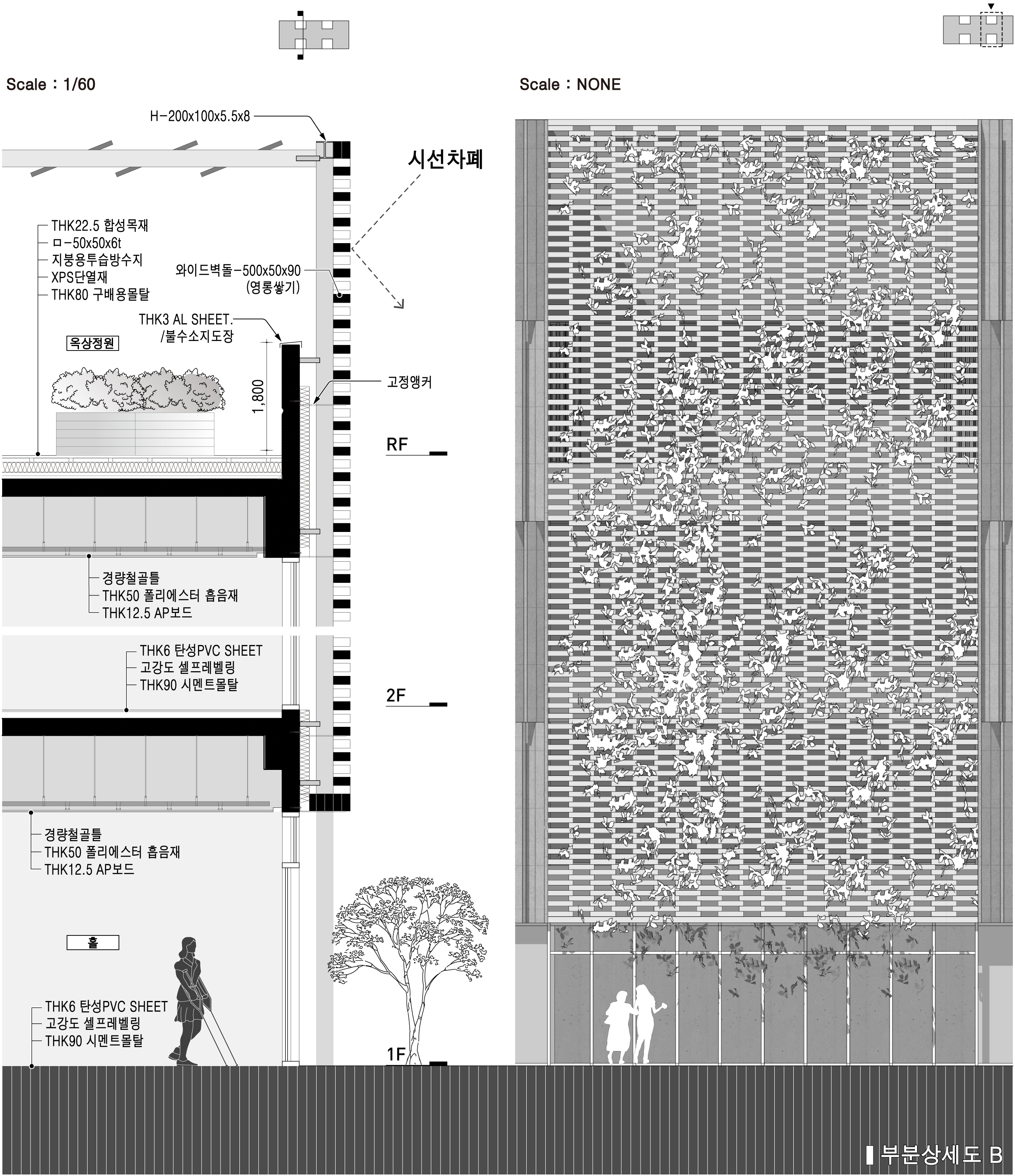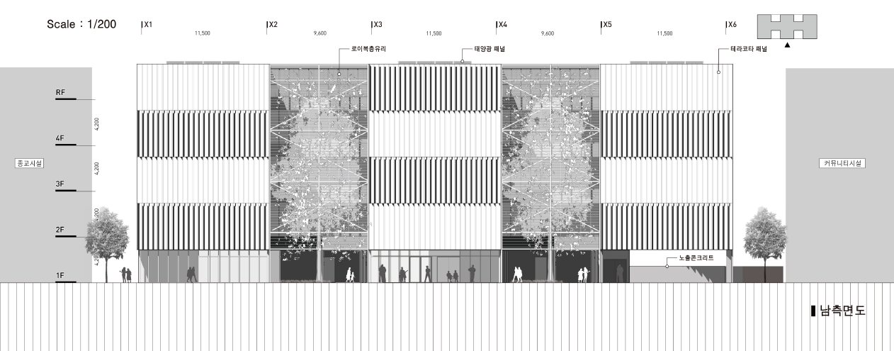 남측면의 비워진 중정은 루버를 중심으로 담쟁이넝쿨과 키 큰 나무로 시각적인 차폐와 동시에 각 층에서 같은 자연공간을 바라볼 수있는 디테일이 만들어진다. 동시에 일층을 오픈해 주민들에게 열어주며 건물 이용자들과의 자연스러운 소통을 이끌어 이용자들이 사회적으로 고립되지 않게 이 공간들이 모여 이들에게 이곳이 나아갈 발판이 되게끔 의도하였다.