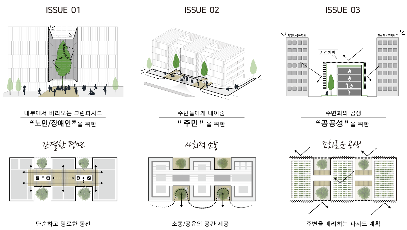 사업 대상지의 남측과 북측에는 아파트가 들어선다. 아무리 이용자가 장애인과 노약자라고 한들 주민들과의 공생과 배려없이 계획하는 것은 바람직하지 못하다. 이런 맥락을 받아주는 계양구립종합누리센터는 어떤 모습이어야 할까?