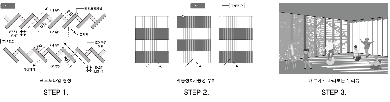 중간 중간에 비워주는 중정으로 빛이 흘러들어가 내부를 그린뷰로 더욱 쾌적하게 만들어 주며, 3단계 입면 STEP으로 공생의 파사드가 형성된다.