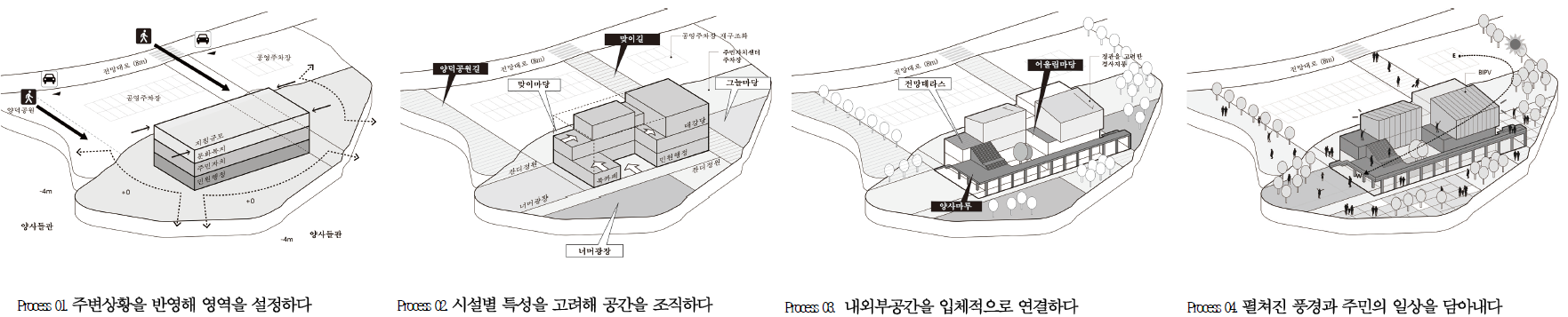 이처럼 다층적인 내외부의 주민공간이 연장되고 확장되어 다양한 주민들의 커뮤니티로 가득 찬 주민자치센터의 활기찬 이야기가 펼쳐질 것이다.