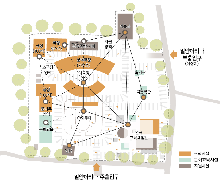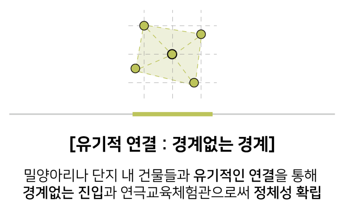 이 건물의 핵심공간인 블랙박스형 극장을 2층에 계획하여, 진입부와 직결되는 1층은 다양한 마주침이 일어나는 오픈스페이스로 열어줘 관광객과 이용객들이 연극전/후에 서로 만나 소통하며, 다양한 외부공간을 만들어 즐길 수 있는 공간을 만듦으로 발걸음을 이끈다. 그리고 기존의 밀양아리나 건물들의 스케일에 맞는 대응형 프로그램들을 1층에 분산시켜 이용성을 증대시켰고, 관리자들의 물품하역동선이 고려되어 있는 차량동선과 보행자영역을 명확히 분리시킴으로 안전성을 높혔다.