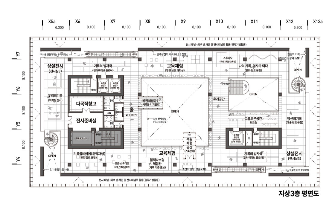 주변 맥락을 받아주며 사방으로 열린 진입동선을 통해 건물 내부에 들어오면, 수직으로 시원하게 뚫린 아트리움을 마주하게 된다. 건물 가장자리로는 기록물을 선택적으로 열람하는 도입전시가 마련되며 사진, 영상, 비디오, 도면 등 다양한 콘텐츠의 서가들로 관람객의 도입을 맞이한다. 그 안의 크고 작은 보이드 공간은 다양한 전시 동선과 그 속에 떨어지는 빛으로, 관람객의 흥미를 더욱 유발하게 된다.