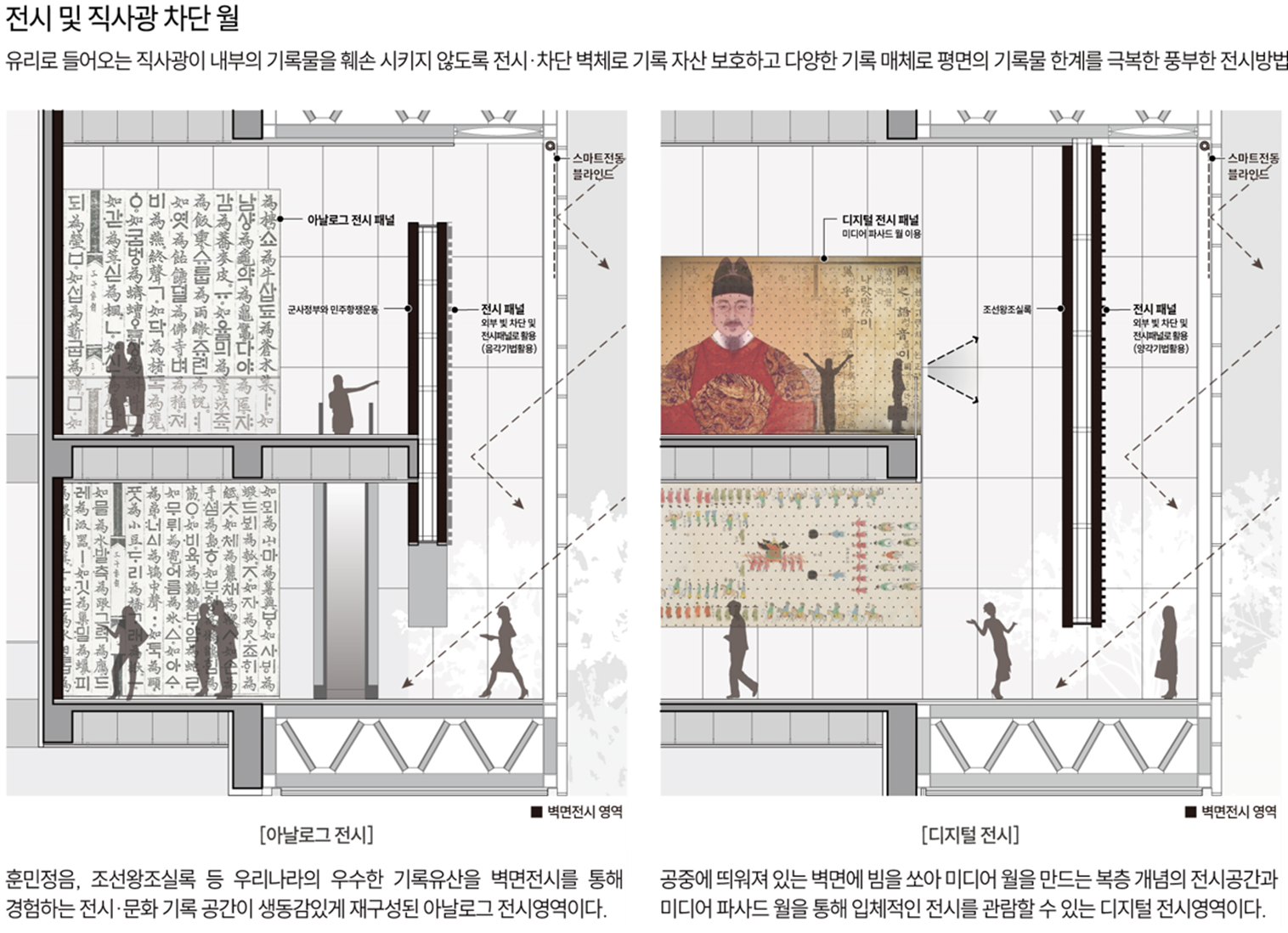 내측 벽면은 아날로그와 디지털을 넘나들며 다양한 기록 전시로 채워질 수 있게 만들어 준다. 이처럼 건물 자체가 하나의 기록물이 되는 우리 박물관은 시간성에 따라 표정이 바뀌는 전시 형태의 새로운 변화를 이끌어 내게 된다.