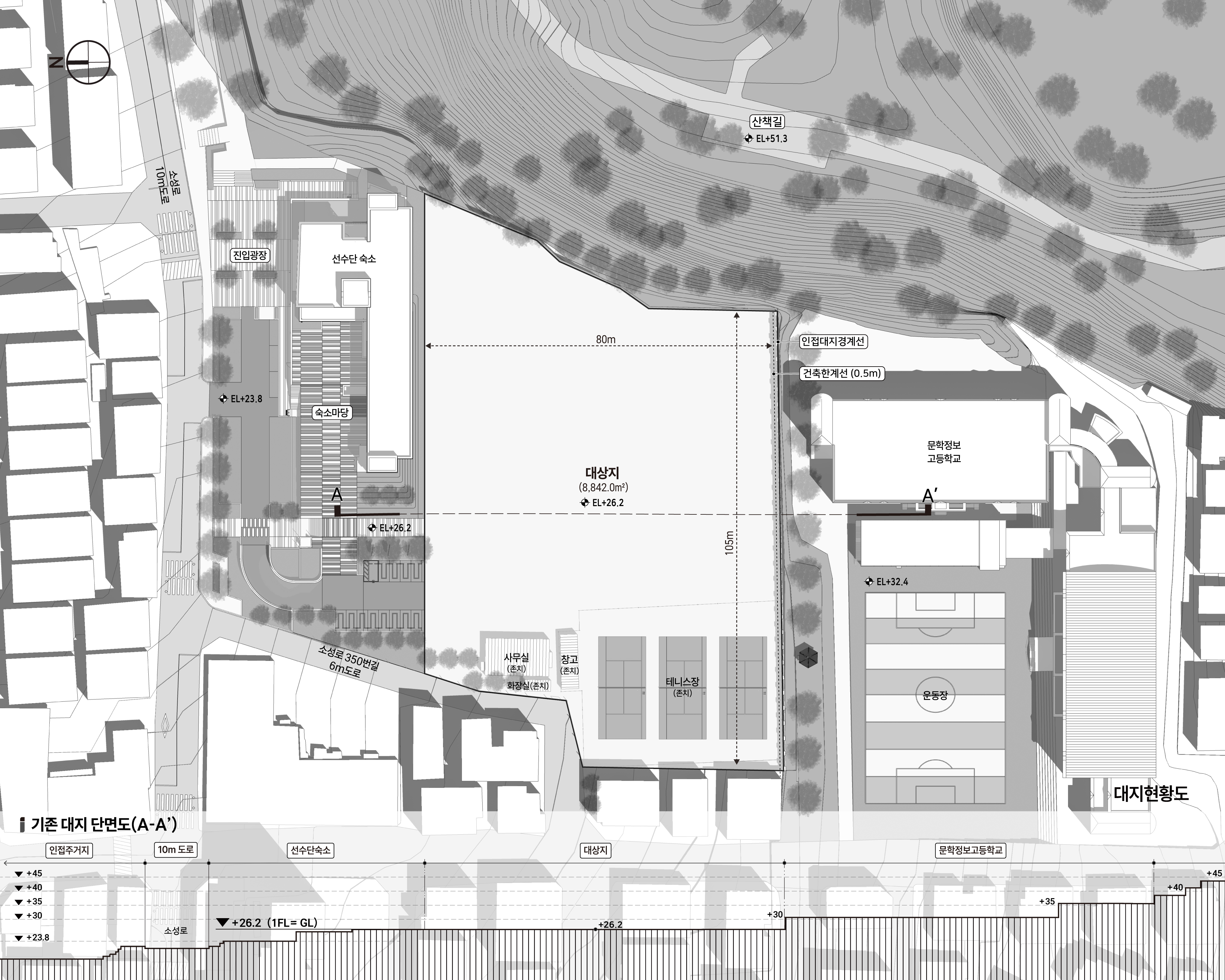 해당 대지는 북측으로 선수단 숙소, 동측으로 문학산의 산맥과 남측으로 문학정보고등학교의 운동장이 위치해있다. 차량과 보행은 북측의 소성로 10m도로에서 진입하고 선수단 숙소 대지를 통해 다목적 훈련장으로 올라온다. 이러한 특징을 살려 대상지는 주변의 시설물과 공간적인 관계를 맺는 위치가 되어야 한다. 주변 외부공간과의 유기적인 관계를 맺으며, 훈련과 휴식, 이동과 머무름이 유연하게 연결될 수 있도록 분리된 공간들을 하나로 묶고, 흐름을 만들며 쾌적한 자연 속 훈련의 개념을 만들어야 한다.