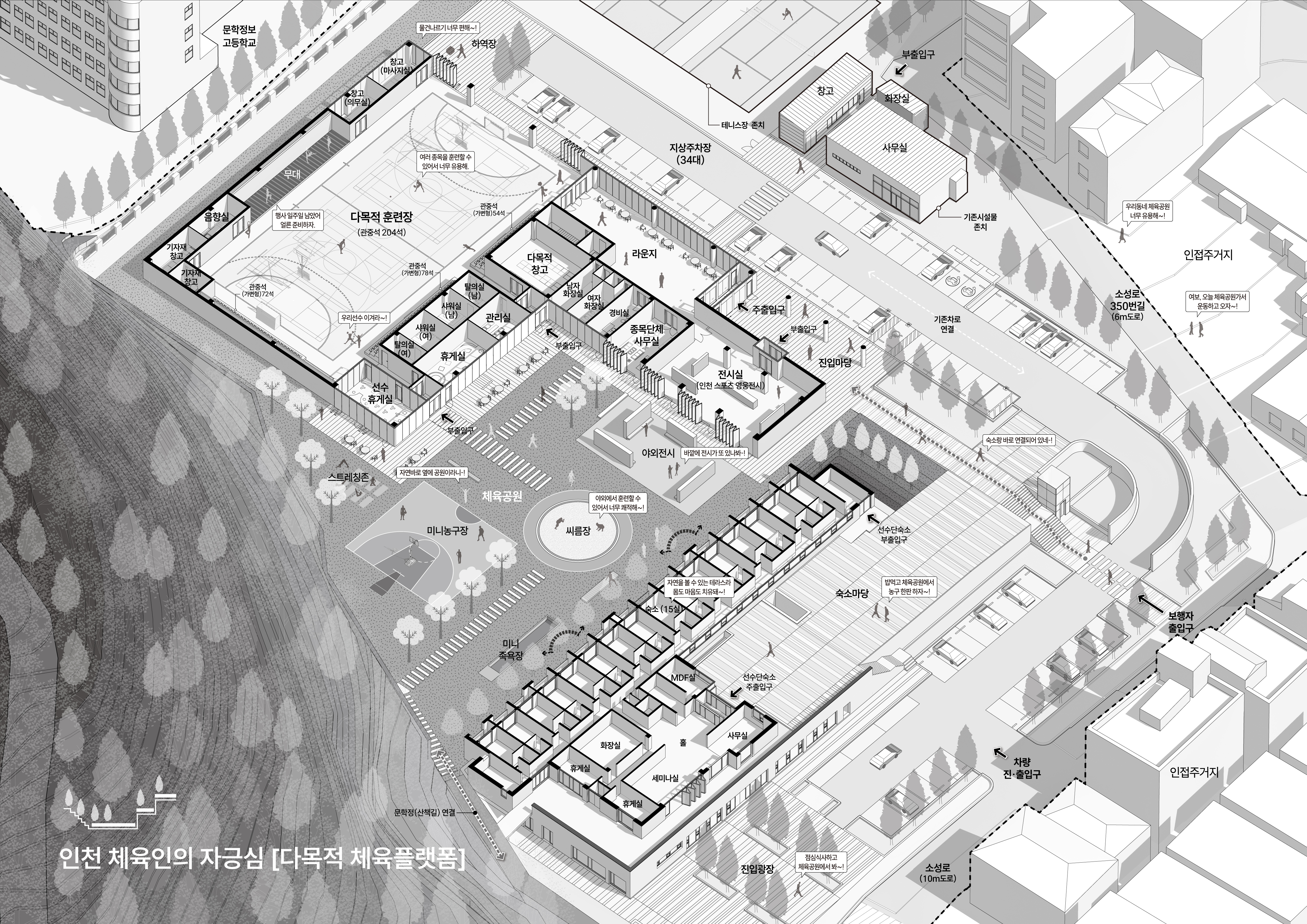 미추홀구 문학동의 인천 선수단 숙소 뒤에 자연을 마주한 다목적 훈련장이 들어선다. 다목적훈련장은 인천시 문학 경기장 내 노후화된 가설 훈련장을 개선해 전문체육인과 생활체육인이 함께 쓰는 훈련장과 종목단체 사무실을 함께 신축하는 프로젝트이다. 주변의 수려한 자연과 북측에 바로 면해있는 선수단 숙소와의 연계를 가장 큰 주안으로 가지고, 쾌적한 훈련공간과 함께 효율적인 업무공간이 형성된다.