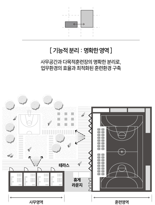 세 번째로, 훈련영역과 사무영역의 명확한 기능 분리로 최적화된 훈련영역과 효율적인 업무공간 구축한다. 다목적 훈련장을 메인으로 샤워 · 탈의실, 휴게실 등 관련성 높은 지원시설들을 인접 배치하며, 하나의 훈련 클러스터를 만들어 이용자들의 편의성을 증진시키고, 사무영역은 가변 가능한 공간으로 유기적인 가능성을 열어두며, 각 실들에 테라스를 열어주어 공원과 입체적, 수직적인 관계를 만들어 준다.
