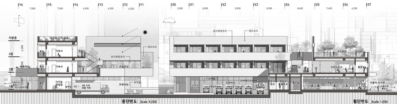 방문 고객 응대와 우편·물류 운영의 효율을 동시에 고려한 조닝을 통해, 효율적이고 기능 중심의 동선이 구현된다. 또한 기능별 천장고를 계획해 쾌적한 발착 공간을 조성했으며, 이러한 단면 계획은 실내외 쾌적성 확보에도 긍정적인 영향을 미친다.