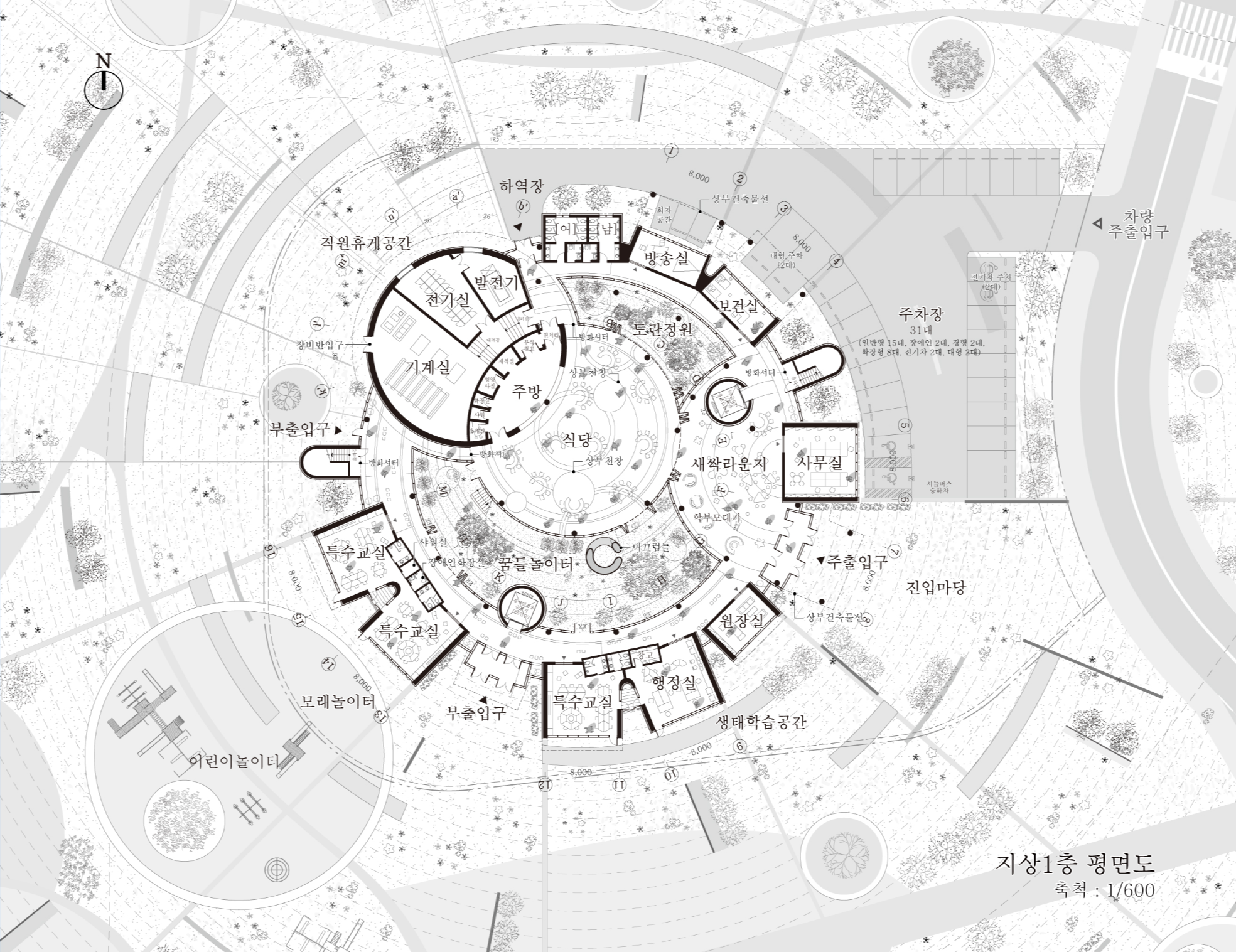 모든 교실과 유희실은 남향으로 배치해 밝고 따뜻한 학습환경을 만들었으며, 유희실은 연령에 맞는 테마를 갖춰 아이들의 활동 폭을 넓혔다. 교사실은 각 교실과 중정을 자연스럽게 관찰할 수 있는 위치에 두어 실내외를 오가는 아이들을 안전하게 보조할 수 있도록 했다.