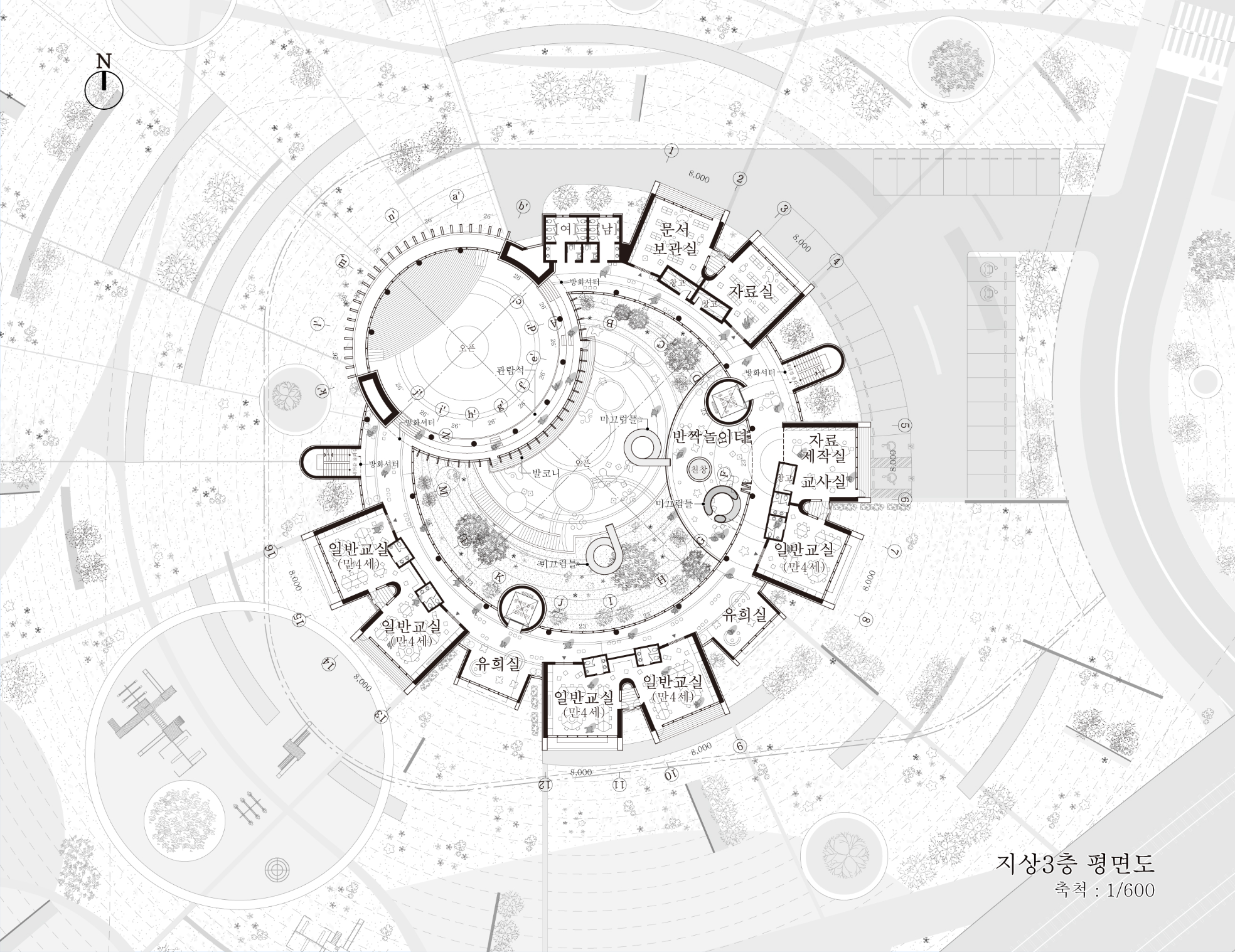 전체 공간은 360도 순환형 동선으로 구성되어 아이들이 경계 없이 자유롭게 움직이며 어디서나 열린 시야를 갖는 안전한 놀이환경을 제공한다. 또한 층마다 배치된 외부 놀이터의 미끄럼틀은 유사시 신속한 대피가 가능한 피난 동선으로도 기능해, 놀이와 안전성을 동시에 확보한 유치원의 중요한 요소가 된다.
