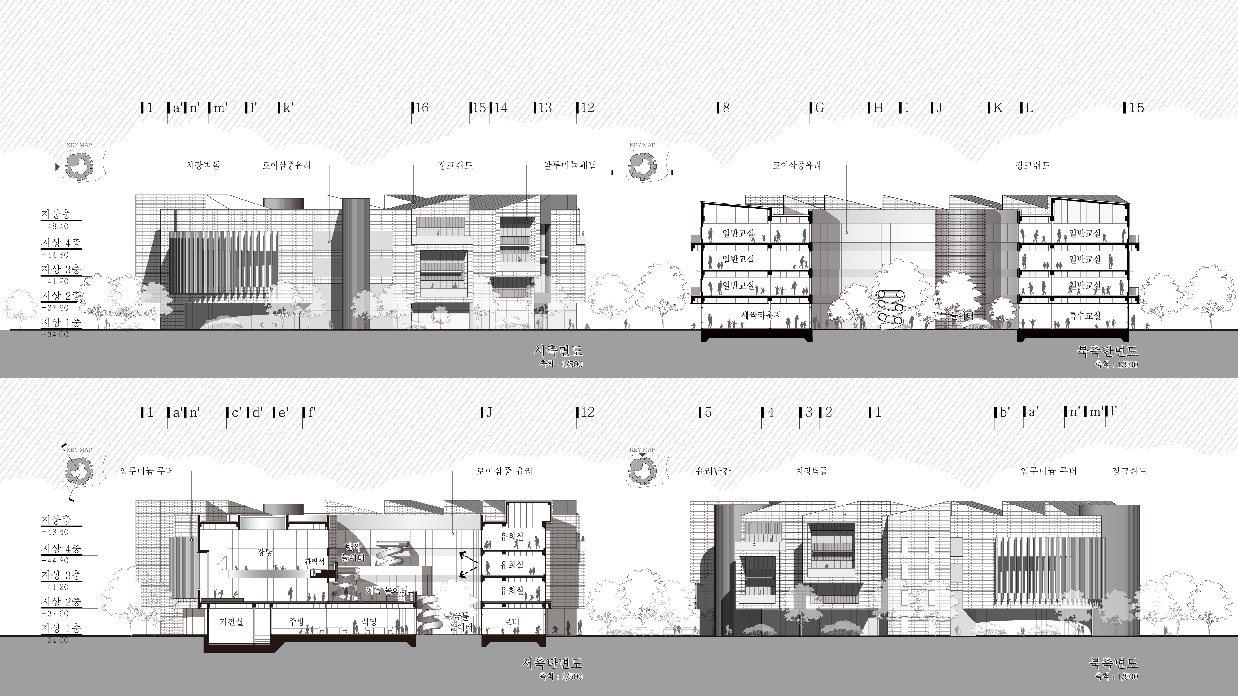 층마다 다른 레벨에서 이어지는 외부 놀이터와 실내 공간의 관계는 아이들에게 다채로운 공간 경험을 제공하며, 그 속에서 창의성이 자연스럽게 자랄 수 있음을 보여준다. 중정에서 공원으로 이어지는 수직·수평의 흐름은 공간이 확장되는 방향을 명확히 드러내고, 식당과 강당 또한 외부 놀이터와의 연계를 통해 다양한 방식의 활동과 배움이 가능하도록 열려 있는 구조를 갖추었다.