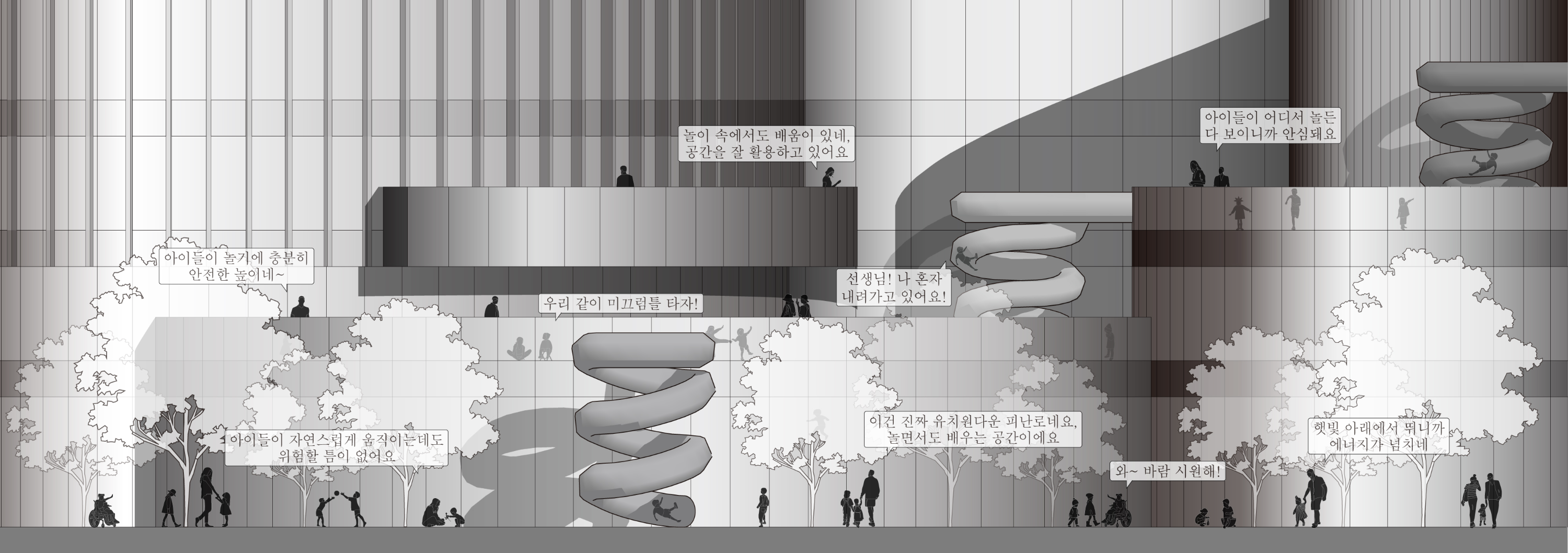 도심의 공원 속에는 아이들을 위한 놀이터가 있다. 이곳은 놀이가 자연이 되고, 배움이 놀이로 이어지는 아이들의 정원이다. 층층이 펼쳐진 놀이터와 다채로운 입면, 그리고 공간 자체가 놀이가 되어 아이들의 호기심과 상상이 자라는 보다 창의적인 갈매유치원을 제안한다.