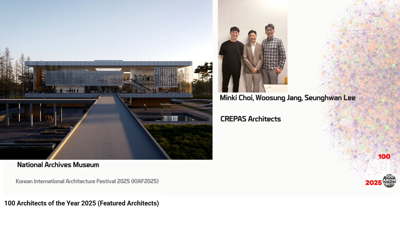 한국건축가협회와 국제건축가연맹(UIA)이 공동으로 주최하는 <2025 올해의 건축가 100인 국제전> "100 Architects of the Year 2025" 에 저희 [크레파스 건축]이 초대되었습니다. 세계 건축의 흐름 속에서 폭넓은 국제 교류를 통해 우리 건축의 새로운 전기를 마련합니다. 현대 건축과 세계 건축가들의 철학을 한 자리에서 확인하고, 건축 문화를 대중과 공유하는 소통의 장이 되고자 합니다.